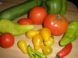 Zucchini, yellow squash, cukes, peppers, tomatoes, basil and chard soon filled our basket.
