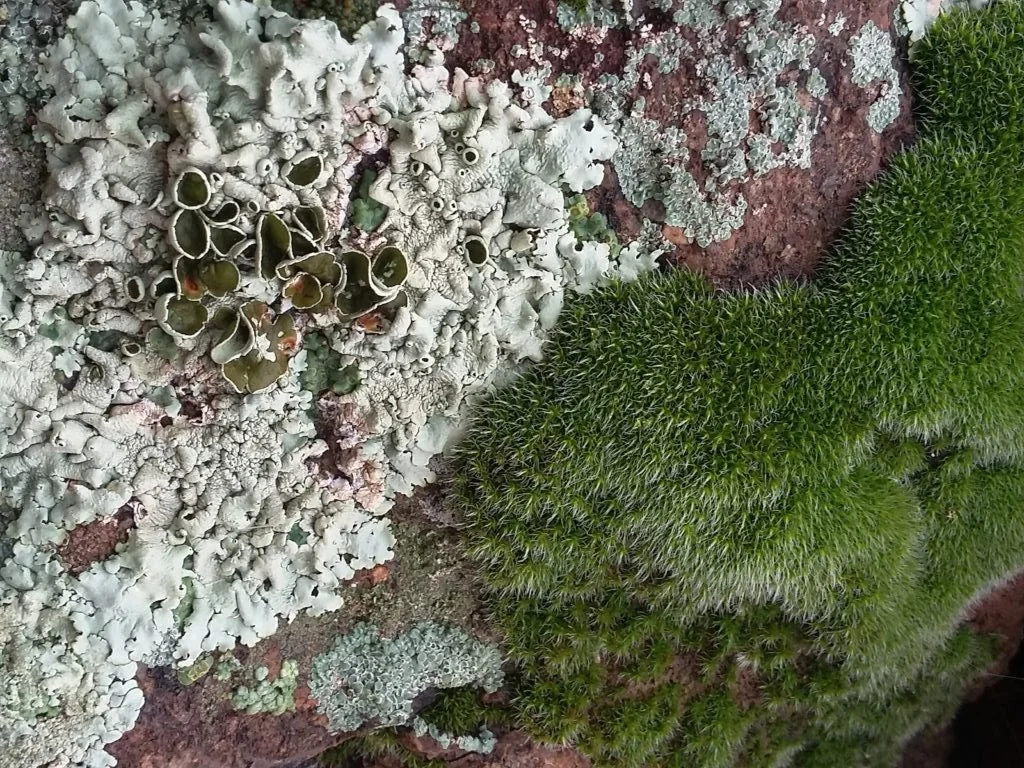 Over time, rock lichens sink their spreading thallus "into every minute nook and cranny" of the rock, gradually breaking apart tiny rock fragments as the lichen expands and contracts, depending on the availability of moisture. Seeds fall into the cracks created by the lichen, allowing other plants to grow. The website Desert USA speculates that the lichens arrive first to a rocky surface and "then other plants such as mosses and grasses begin to grow, followed by herbs, hardy shrubs, and finally trees."