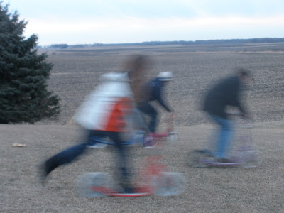 Riding scooters down the hill at my parents' home in Minnesota. When there wasn't any snow, we found our own fun.